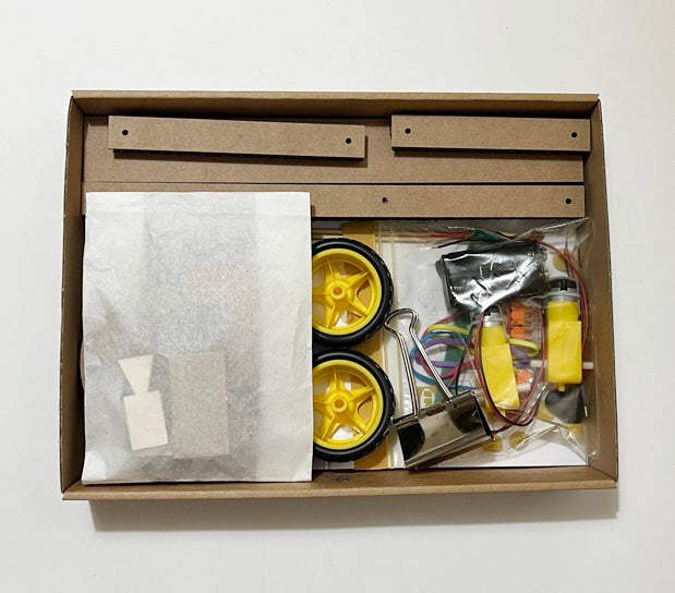 Das Set enthält alle Materialien, um den Roboter zusammenzusetzen: Papierschablone, Motoren mit Halterungen, Roboterarme, Stifthalterungen, Gummibänder, Verbindungsteile und einen Batteriegürtel – alles, was du brauchst, um deinen eigenen Malroboter zu bauen.